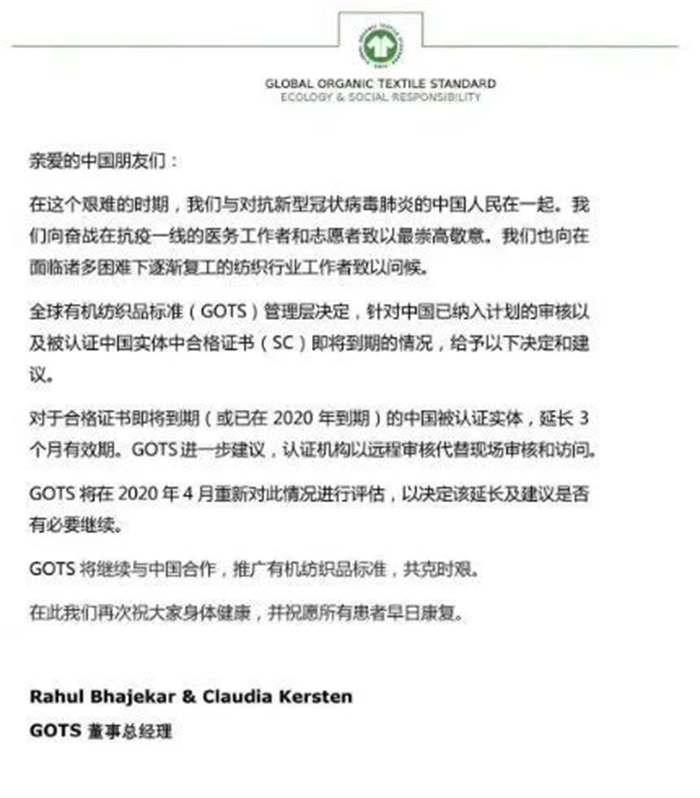 受疫情的影響,全球有機紡織品標準(GOTS)管理層決定,延長GOTS證書的有效期!具體信息如下: