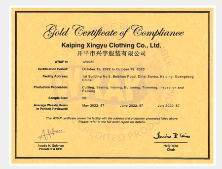 本文來源:驗廠之家網 - 祝賀開平市興宇服裝有限公司2022年一次性成功通過WRAP認證