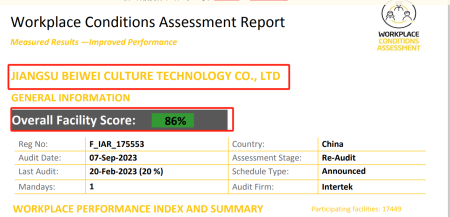 本文來源:驗廠之家網 - 祝賀江蘇百威文化科技有限公司2023年一次性成功通過ITS-WCA驗廠
