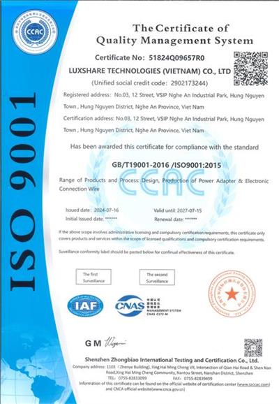 祝賀立訊技術(越南)有限公司 LUXSHARE TECHNOLOGIES (VIETNAM) CO., LTD 2024年一次性成功通過ISO9001認證