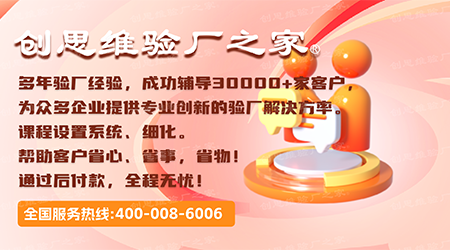 如果企業想做驗廠輔導,不妨考慮一下創思維驗廠之家,創思維驗廠之家是專業的驗廠輔導公司,已經為全國各地上萬家企業服務過,在全國多處設有辦事處,會就近安排老師進場輔導,我們的輔導原則是幫助企業通過驗廠,深圳市創思維是一家正規專業的驗廠咨詢、驗廠輔導、認證輔導公司,一切以合同條款為準,不亂收費,并盡可能為企業節約成本,通過后付款!
