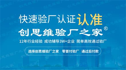 如果企業想做驗廠輔導,不妨考慮一下深圳市創思維,創思維驗廠之家是專業的驗廠輔導公司,已經為全國各地上萬家企業服務過,在全國多處設有辦事處,會就近安排老師進場輔導,我們的輔導原則是幫助企業通過驗廠,深圳市創思維是一家正規專業的驗廠咨詢、驗廠輔導、認證輔導公司,一切以合同條款為準,不亂收費,并盡可能為企業節約成本。驗廠零首付,通過后付款,驗廠必過,驗廠無憂!